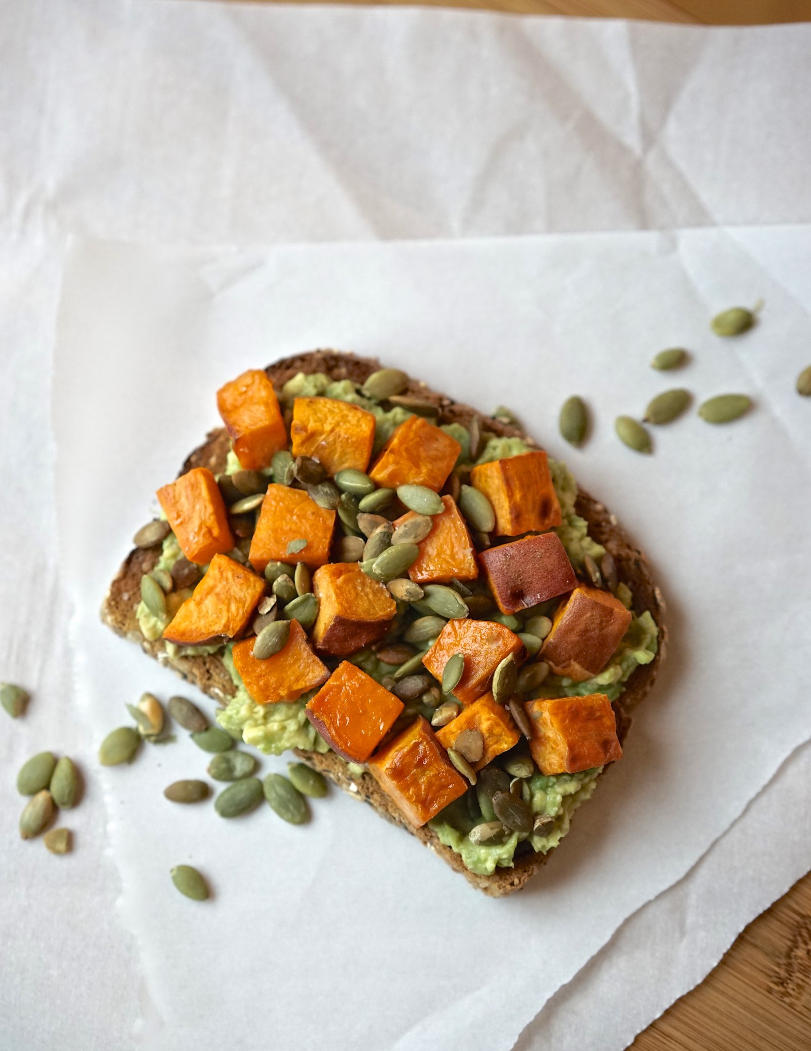 Because perfectly bronzed whole grain bread topped with creamy avocado lightly mashed with zesty fresh lime juice, tender roasted sweet potatoes, nutty pepitas, and glorious sea salt is really hard to beat.