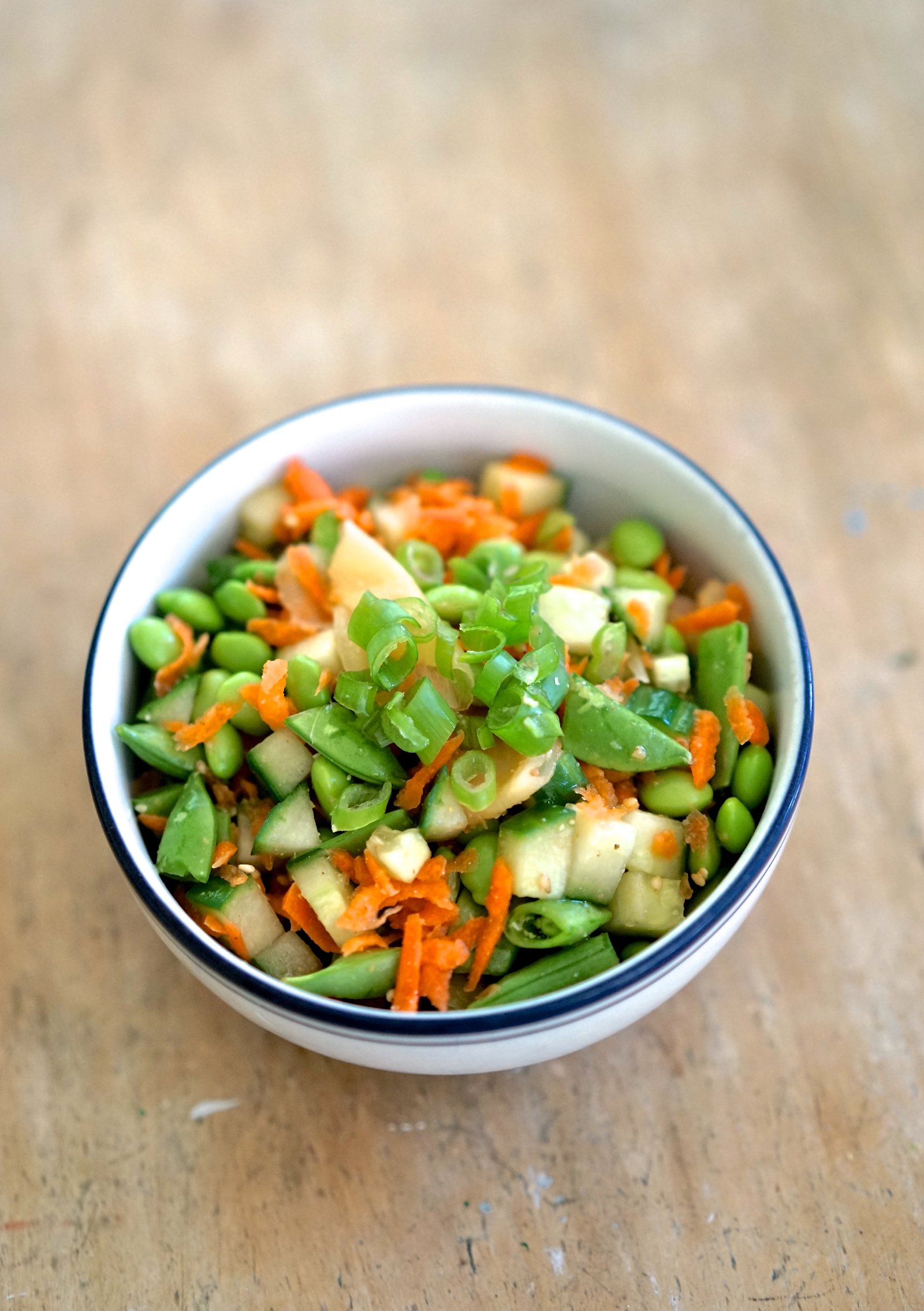 The other day, I folded sweet grated carrots, crisp roughly chopped snap peas, refreshing diced English cucumber and protein-packed edamame with a healthy spoonful of pickled ginger–along with a couple dashes of sesame salt–and BAM.