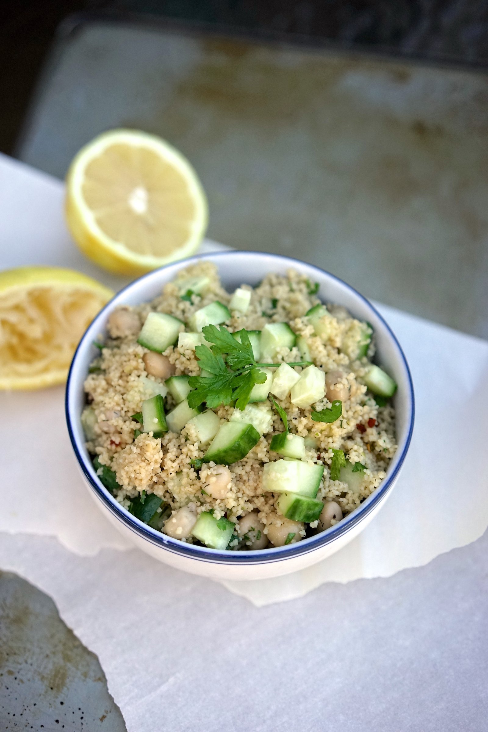 So, set 14.7 minutes of your life aside and fold fluffy whole wheat couscous with creamy canned chickpeas, extra virgin olive oil, fresh lemon juice + zest, herbaceous Italian parsley, fragrant mint, dried drill and oregano, freshly cracked black pepper, crushed red pepper flakes (for a little kick!), sea salt, and last but certainly not least, cooling diced English cucumber.