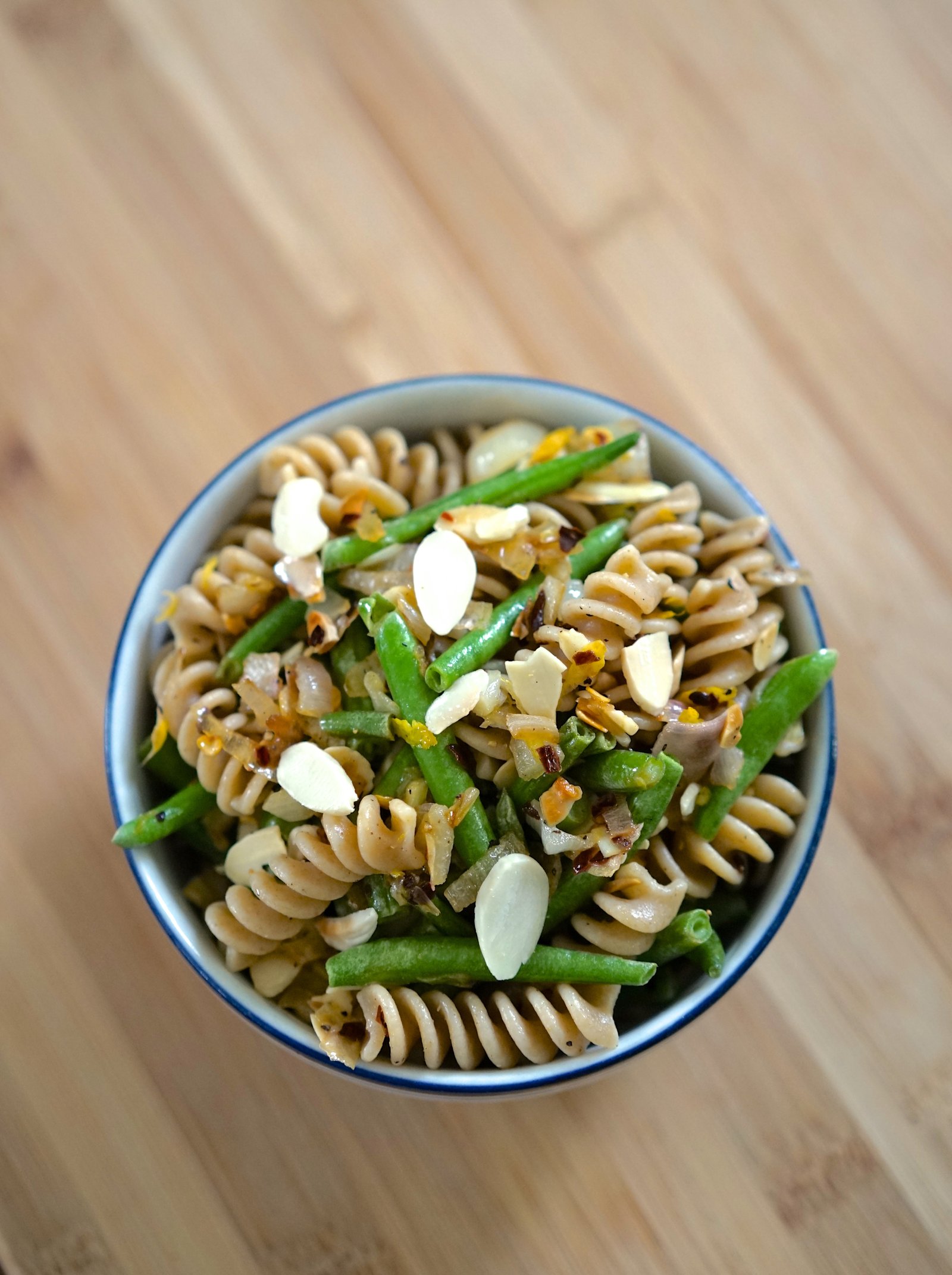 A bowl of fun fusilli (the whole wheat variety for extra health points), tossed with sautéed shallots, crisp-tender green beans, spicy red pepper flakes, fresh lemon juice + zest, nutty toasted almond slices, and lovely vegan Parm is truly a meal and a half.