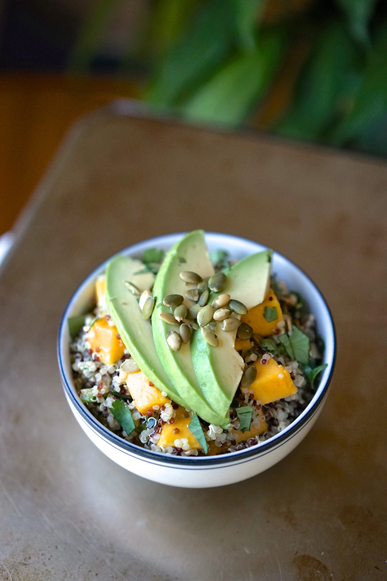 We’re talking steaming hot fluffy quinoa, lusciously sweet diced Champagne mango, fresh lime juice and zest, spicy minced jalapeño, herbaceous cilantro, nutty toasted pepitas, a splash of extra virgin olive oil, plus creamy avocado slices and sea salt to taste.