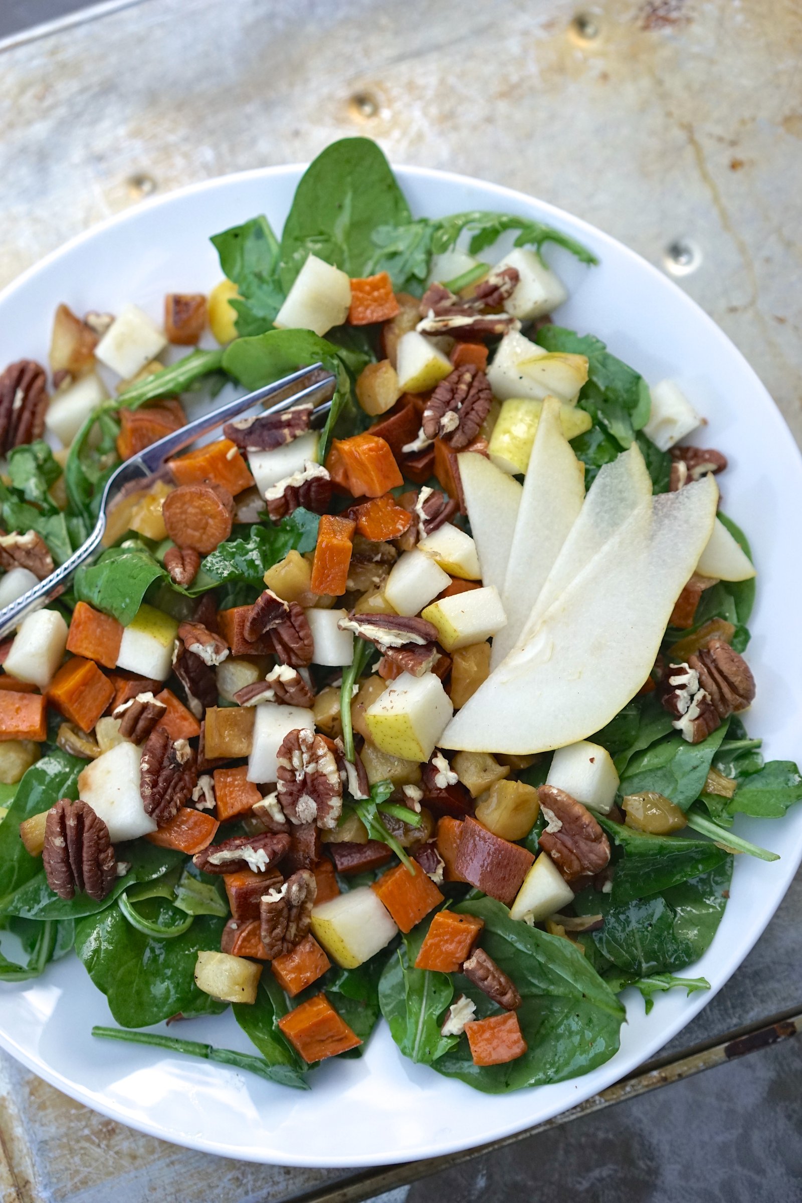 I mean, it’s hard to go wrong with tender roasted sweet potato AND apple, plus juicy pear, toasted pecans, and a simple maple apple cider vinegar dressing!
