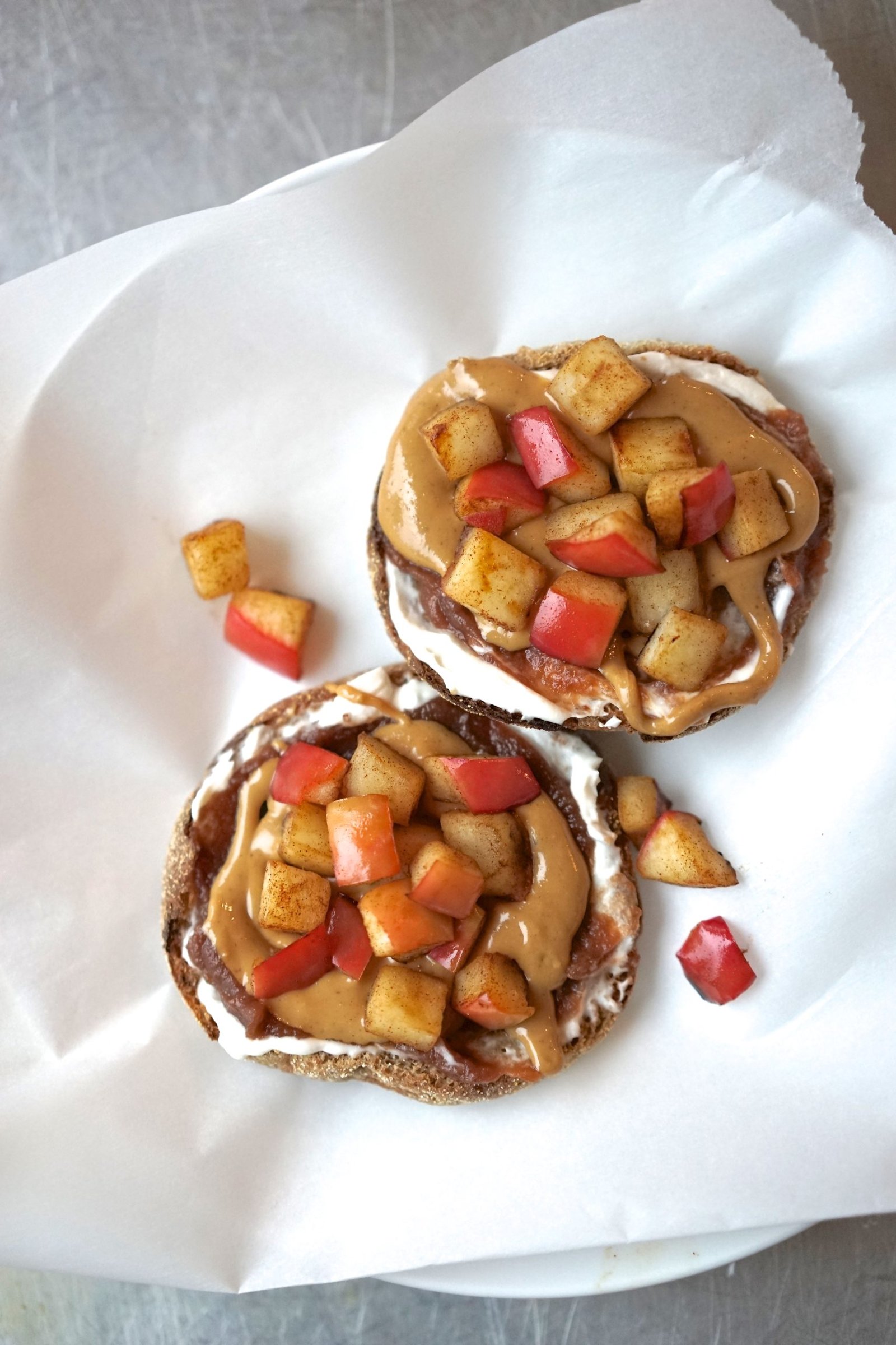 Take your toasty whole grain English muffin halves, then spread on luscious vegan cream cheese (the secret), followed by sweet-tart apple butter, nutty drippy peanut butter, and finally your tender cinnamon apples.