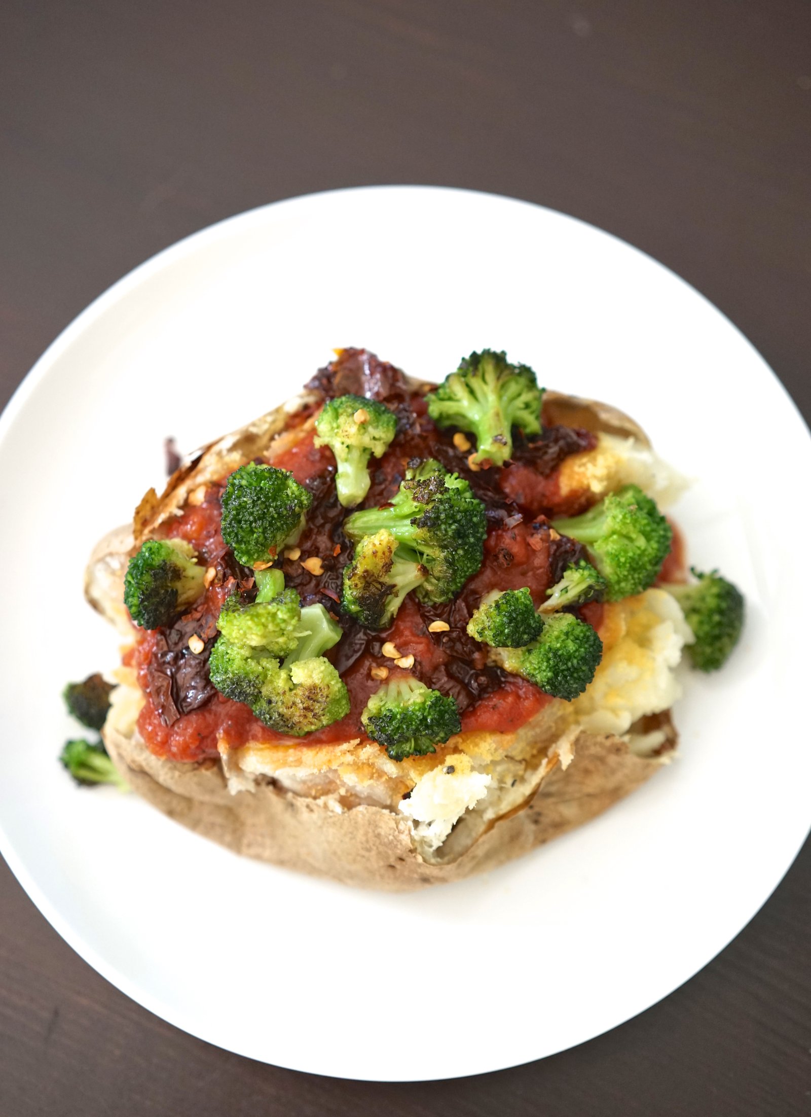 So grab yourself a hot potato then top her off with savory nutritional yeast, your fave marinara, flavorful sun-dried tomatoes, sautéed broccoli, crushed red pepper flakes for a little kick, a pinch of sea salt and fresh ground black pepper, plus vegan Parm!