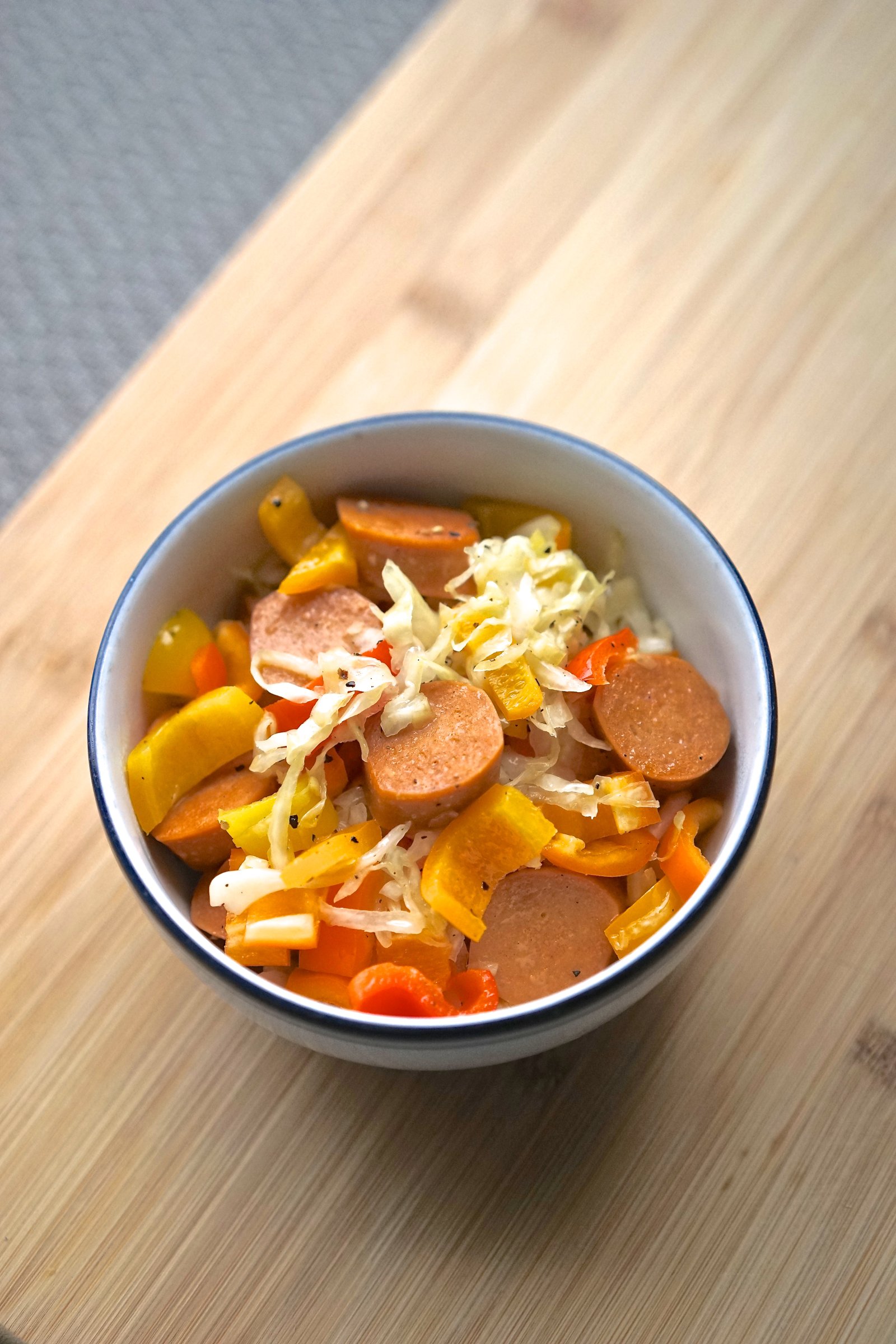 Feeling the need to embrace my inner Schneider–but really just wanting food quick–I recently threw together a speedy skillet comprised of a lightly browned veggie dog, sliced multi-colored bell peppers (compromise, peeps), and my fave classic kraut, along with freshly cracked black pepper, plus a generous spoonful of mustard.